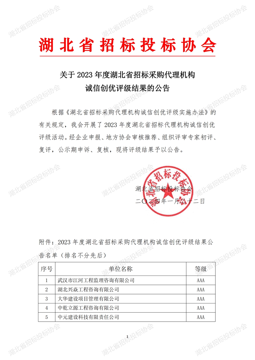 關(guān)于2023年度湖北省招標(biāo)采購代理機構(gòu)誠信創(chuàng)優(yōu)評級結(jié)果的公告